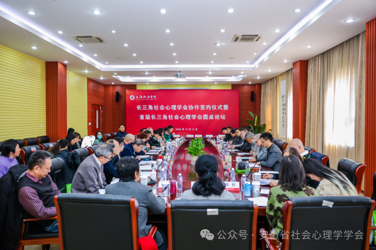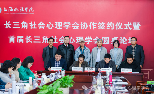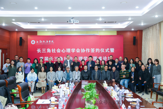 12 月 14 日下午,长三角社会心理学会协作签约仪式暨首届长三角社会心理学会圆桌论坛在上海政法学院圆满举行。本次活动由上海市社会心理学学会主办,上海政法学院承办,中国社会心理学会候任会长王俊秀,中国心理学会监事长、复旦大学教授孙时进,上海、江苏、浙江、安徽三省一市社会心理学会会长、专家学者及代表参加活动。活动由上海市社会心理学学会会长、上海政法学院党委副书记、纪委书记潘牧天全程主持。学会会长范和生、副会长孔燕、潘莉、夏美武,学会秘书长唐惠敏参加上述活动。